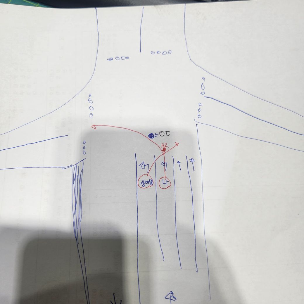 1,2선은 좌회전만 가능한 차선인데 저는 2차선에있었고 상대차는 1차선에 신호 대기중이였습니다 좌회전 신호가 바뀌고 주행중 1차선에 차량이 우회전 깜빡이를 켜고 3차선으로 이동하였습니다 저는 크락션을 울렸고 멈췄지만 뒤에 차가 있어서 지나왔습니다 그차도 지나가고요 내려서확인하니 기스가 났습니다 대처법이 그자리에서 멈춰서 내려서 사진찍고하여야하는게 맞지만 좌회전 하는 중이여서 교차로 가운데 서 있어서 멈출수없어서 지나갔습니다 뺑소니로 신고 하러 갈예정인데 저한테 과실이 있는부분인가요?또는 저한테 벌금이 내려지나요? 상대방은 교차로 변경 위반 사항이 되나요?