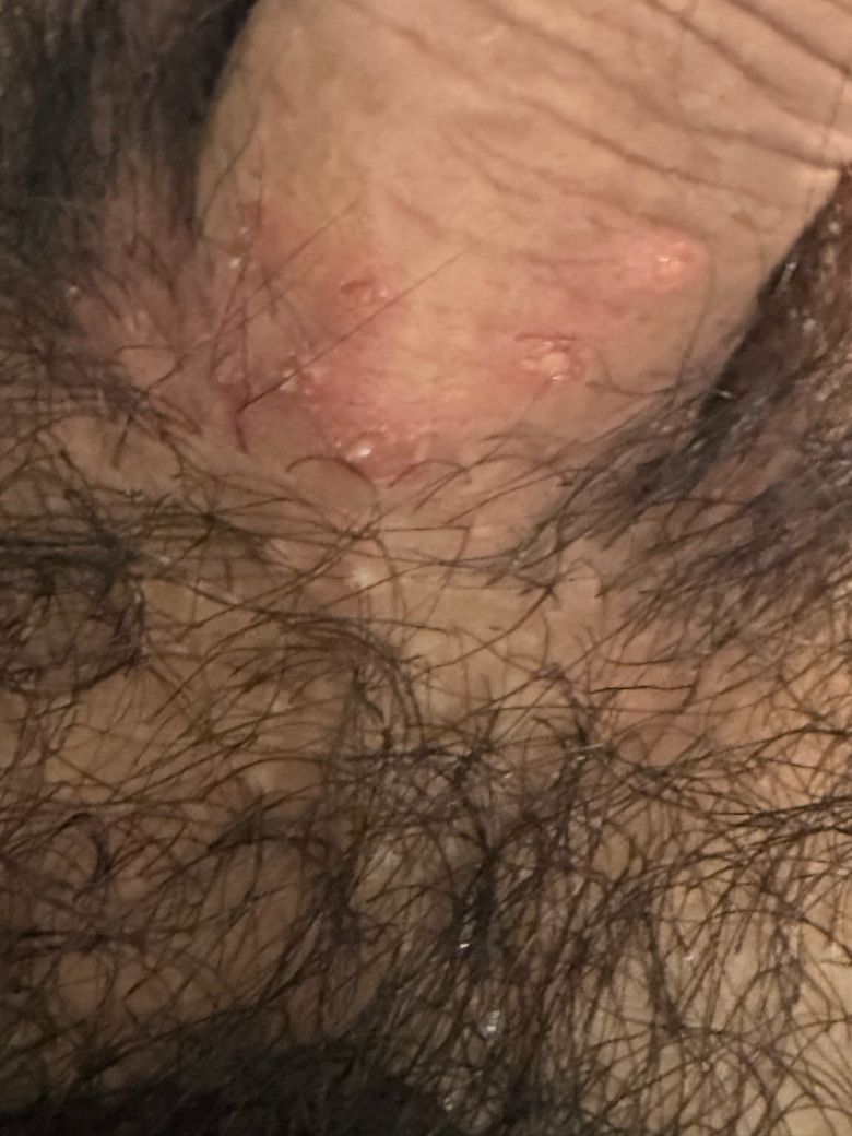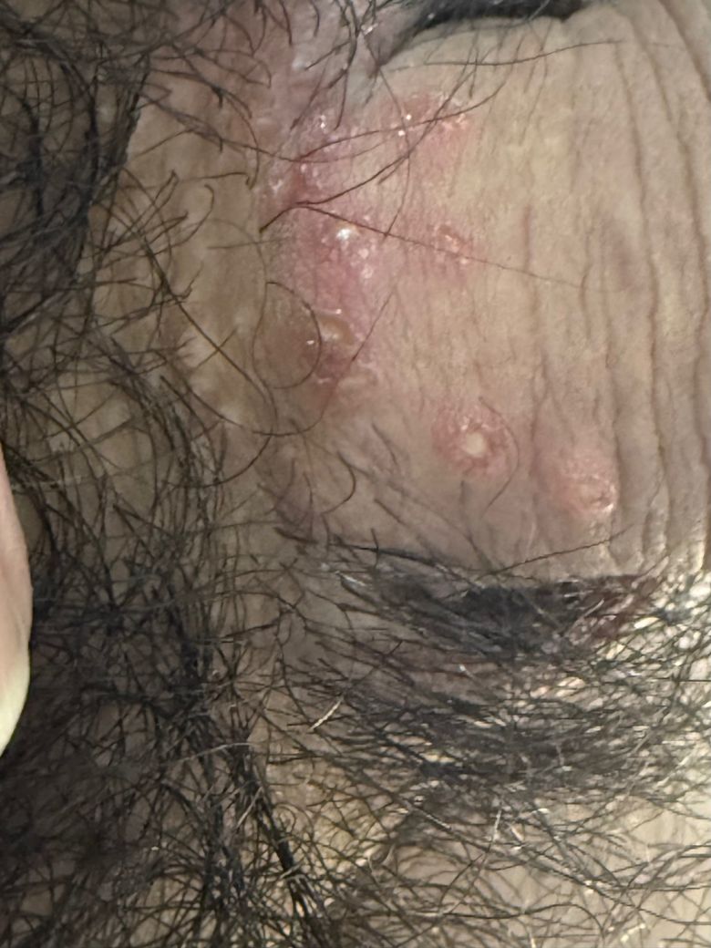 병변이 털이 있는 부위에 국한되어 있고, 각각이 모낭 중심으로 보이는 작은 구진·농포 형태이며, 군집된 수포가 터지며 얕은 미란을 만드는 전형적인 헤르페스 양상과는 다소 차이가 있습니다. 또한 통증이 거의 없고 압통만 약하게 있는 점도 헤르페스보다는 모낭염 쪽에 더 부합합니다. 최근 면도 병력 역시 모낭염의 흔한 유발 요인입니다.