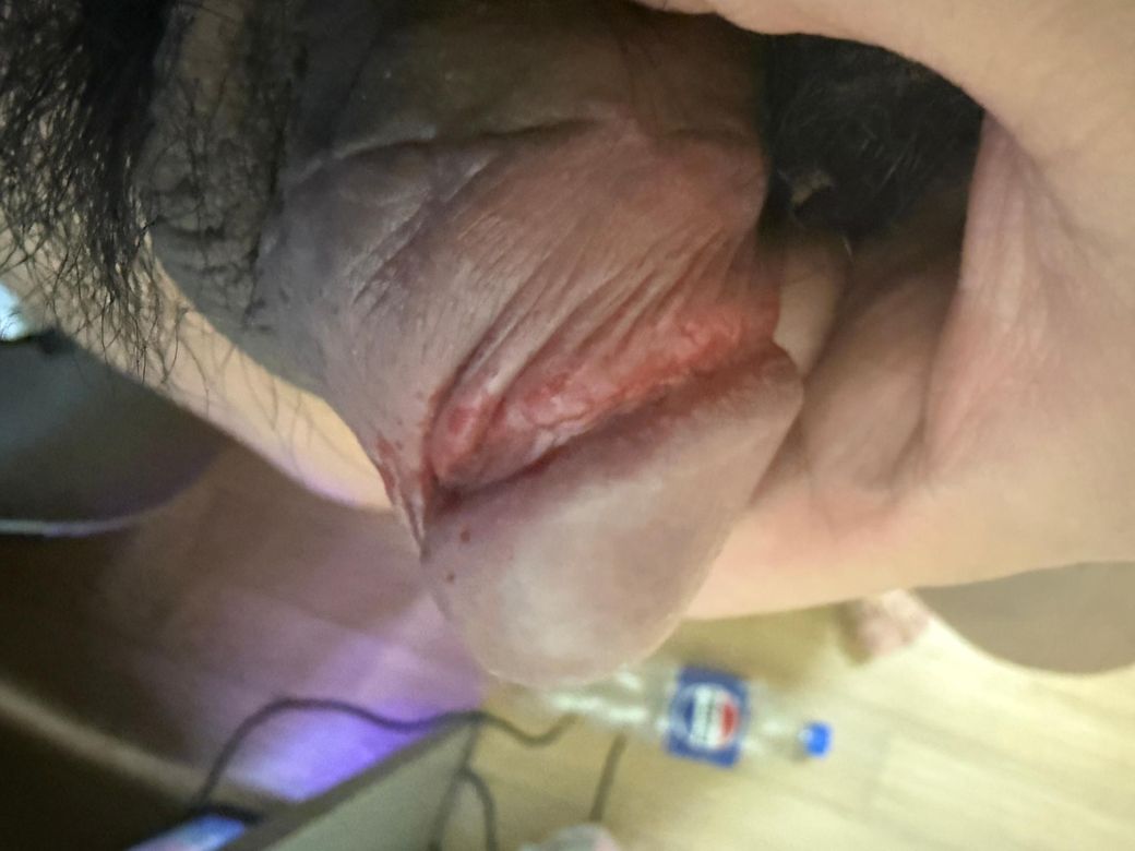 아이고, 왜 그러셨습니까... 사진상 귀두 아래 소대(frenulum) 부위에 표재성 열상과 점상 출혈이 보입니다. 수술 후 6주 정도면 피부 상처는 대부분 치유되지만, 소대 부위는 장력이 많이 걸리는 구조라 마찰이 강하면 쉽게 찢어질 수 있습니다. 비누 사용은 윤활 효과가 없고 오히려 피부 장벽을 손상시켜 열상 위험을 높입니다.
