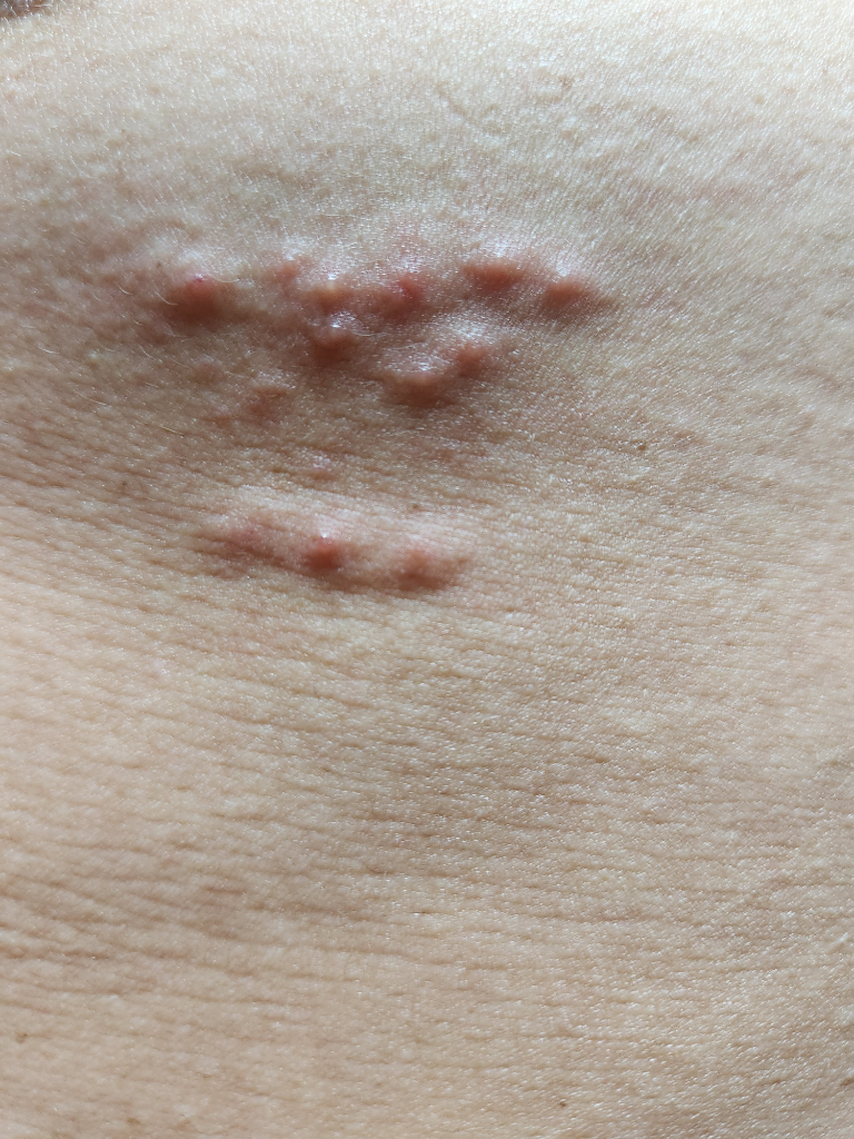 대상포진의 가능성이 있어 보입니다. 정확한 진단을 위해 피부과진료를 받아보시기 바랍니다.