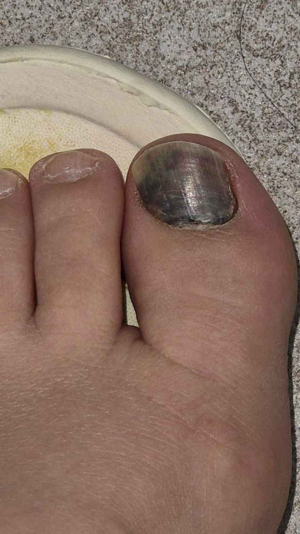 사진상으로는 외상 이후 발생한 발톱밑출혈(조갑하 혈종) 이후, 괴사된 발톱이 유지되고 있는 상태로 보입니다. 이미 2개월 경과한 점을 고려하면 급성기 혈종 배액 시점은 지났고, 현재는 “손상된 발톱이 탈락되고 새로운 발톱이 자라는 과정”에 해당할 가능성이 높습니다.