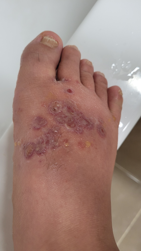 발등은 염증인지 물집인지 진물 가득찬 뭔가가 계속 나는데 며칠지나도 완전 회복이 안되고 어두운 저색깔로 남고 주변에 새로운게 계속 올라오면서 점점 번졌습니다