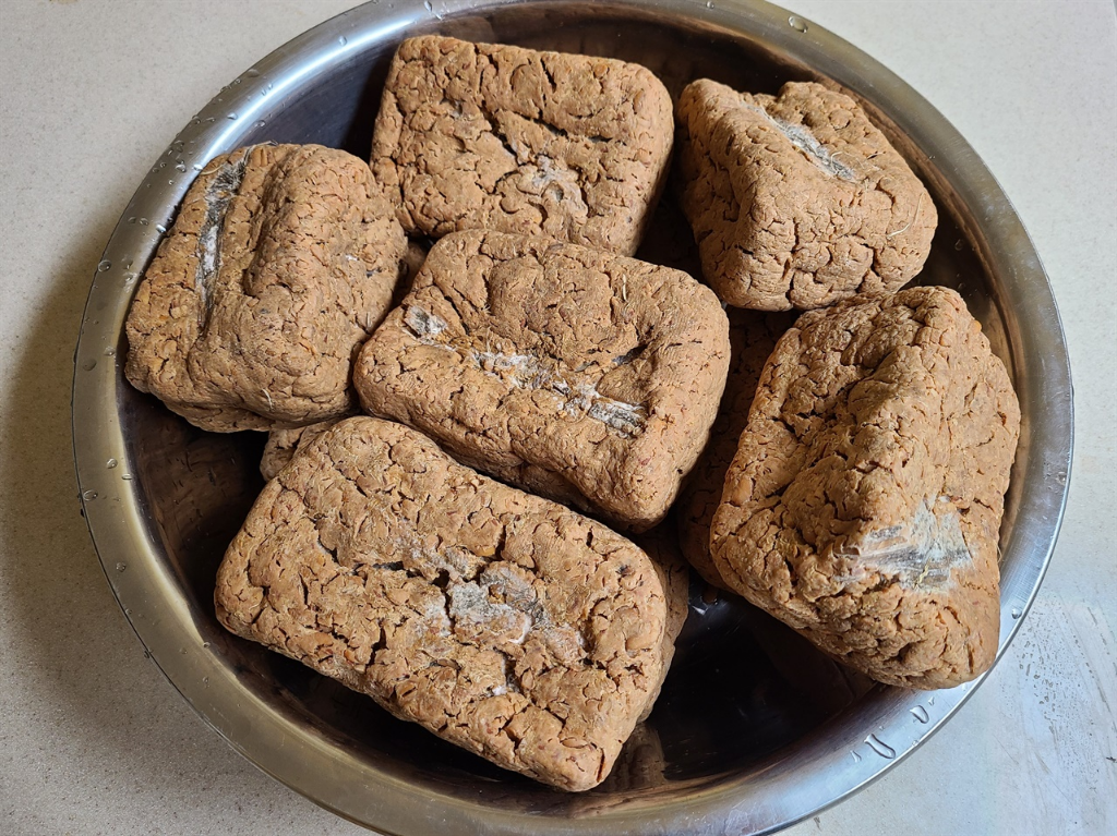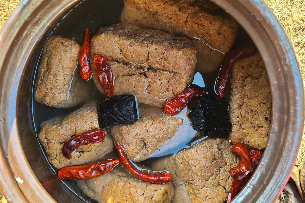 메주는 노란 콩을 삶아서 으깬 뒤 반죽을 해서 빚어가지고 말린 덩어리잖아요.
