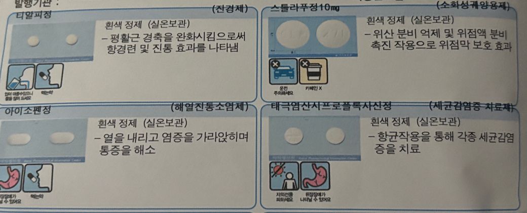 그리고 처방약에는 NSAID 계열의 소염진통제 성분이 아이소펜정이 들어가 있습니다. NSAID 계열의 소염진통제는 공복에 복용 시 속쓰림 같은 위장장애가 생기기 쉬운 약이기 때문에 처방약은 식후에 복용하시는 것을 권장합니다. 즉, 간단하게 빵이라고 드신 후 약을 복용하시는 것이 좋습니다.