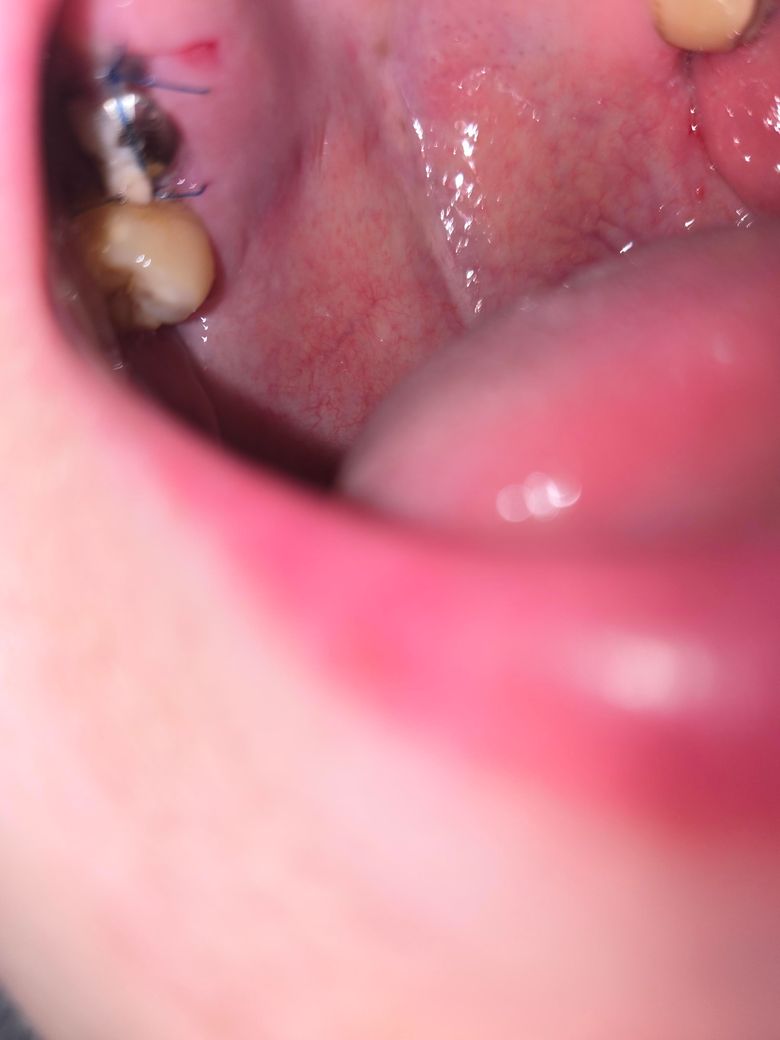 사진에 정확하게 보이지는 않지만 인공차단막(멤브레인)이 삐져 나왔을 가능성 있습니다. 일단 실밥 풀러 갈 때까지 건드리지 말고 그냥 기다려 보는 것을 추천합니다. 더 삐져 나오면 바로 치과에 가야 합니다.