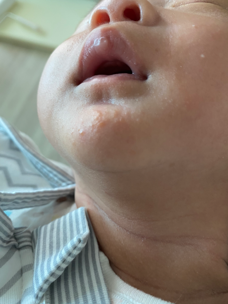 해당 병변 원인에 대해서는 직접 관찰이 불가능하므로 정확히 알기는 어렵습니다. 하지만 신생아의 경우 비립종이 해당 양상과 유사하게 발생할 수 있습니다. 비립종은 각질을 포함한 작은 낭종이 발생하는 것으로 신생아는 자연적으로 시일이 지나면서 사라지는 경우가 많습니다. 정확한 진단을 위해서는 소아과에 내원하시어 진료를 받아보시는 것이 좋겠습니다.