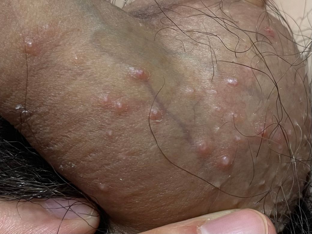 우선 형태가 중요합니다. 현재처럼 털이 있는 부위에 작은 하얀/붉은 구진이나 농포 형태로 다발성으로 퍼져 있는 경우는 모낭염 양상에 가깝습니다. 특히 중심이 하얗게 보이는 병변은 고름이 찬 모낭염에서 흔합니다.