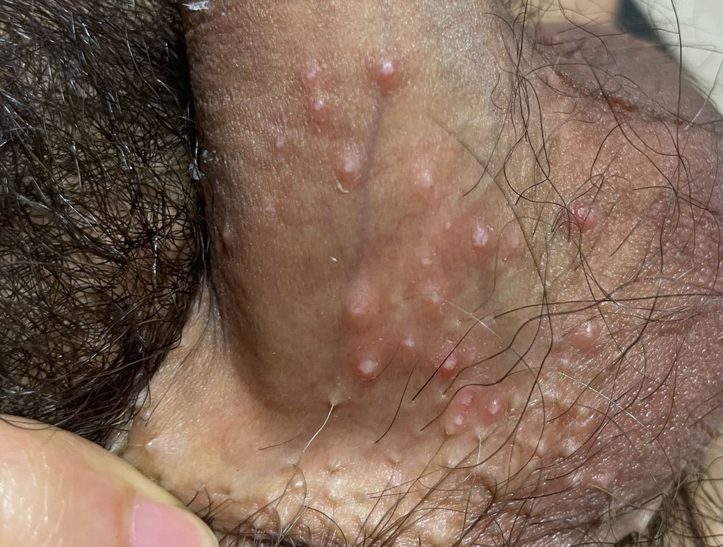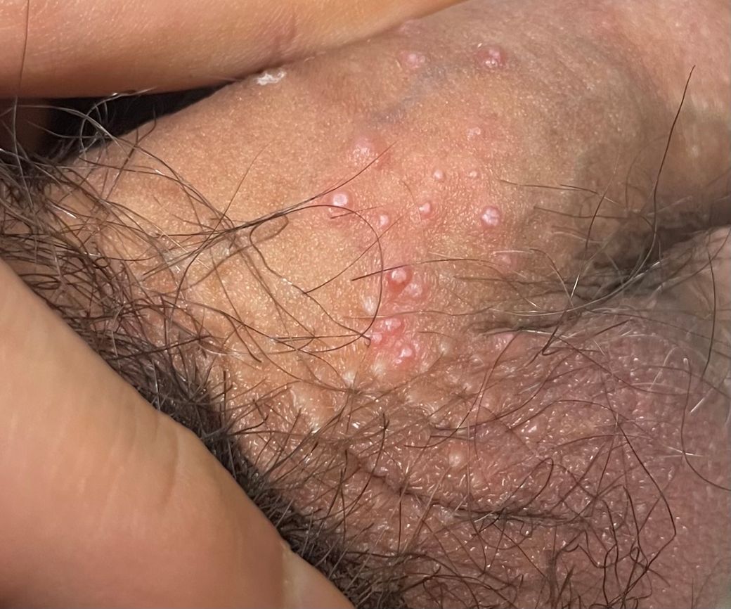 아무리봐도 둘 다 가능성이 떨어져보입니다. 사진과 증상을 종합하면 곤지름이나 헤르페스 가능성은 낮고, 모낭염 또는 피지선 염증 가능성이 더 높습니다.