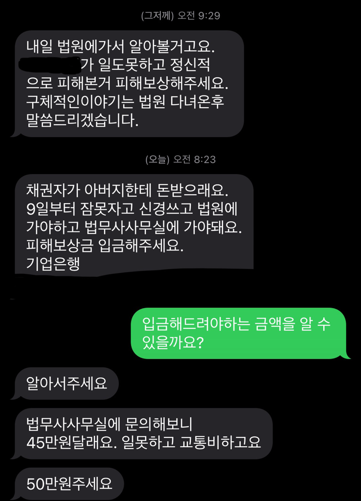 저도 마찬가지지만 집주인도 처음 겪은 일이여서 대처법을 몰랐습니다. 다행인지 아닌지 법원에선 저 포함 아버지의 잘못이 아닌 채권자들의 잘못이고 피해보상을 원해도 채권자에게 받아라 집주인에게 답을 해줬답니다. 그런데 집주인이 채권자는 피해보상을 못해주겠다 말했다며 일이 진행되는 사이에(9~11) 법무사도 찾아가고 정신적으로 힘들어 일을 못했으며 법원을 왔다갔다하며 생긴 모든 비용을 저에게 청구했습니다. 물론 11일 법원에서 모든 답변을 들은 집주인이 저에게 전화를 해서 채권자에게 일단 말은 하겠으나 일이 잘 진행 안될시 다시 말을 하겠다 했고 저도 알겠다 라고 대답은 해줬었습니다. 그래서인지 금일 아침부터 보상금을 요구하기 시작했습니다.