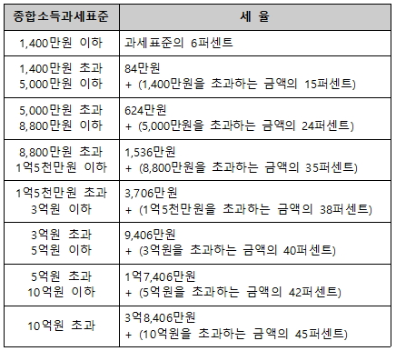 우리나라의 종합소득세율은 아래 표와 같으며, 과세표준별로 6%~45%(지방세 10%는 별도)가 적용됩니다.