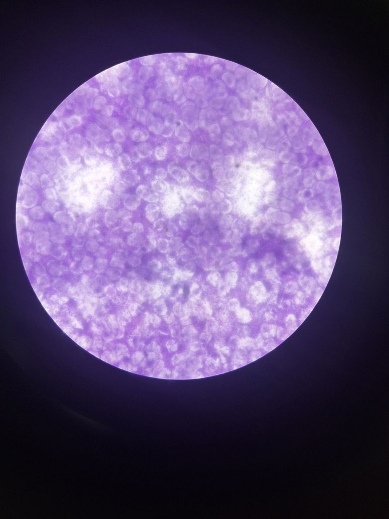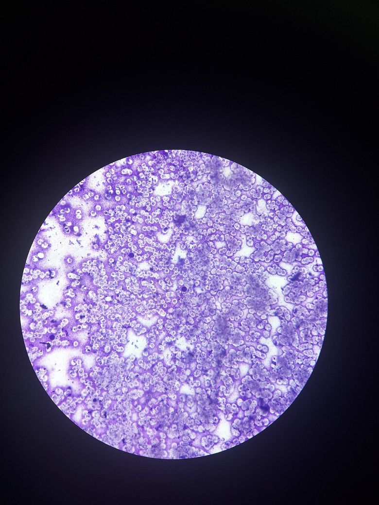 400배율 이미지에서는 세포들이 당연히 더 크게 확대되어 있는 것이 보입니다. 세포의 내부 구조를 더 세밀하게 관찰할 수 있습니다. 윗 문단 설명과 동일하게 백혈구는 보통 더 크고 뚜렷한 핵을 가지고 있으며, 세포질도 적혈구보다 더 많이 보입니다. 몇몇의 세포가 백혈구의 특징을 보여주고 있는것으로 보입니다. 이미지 중앙 상단 부근의 세포는 핵이 보이며 세포질도 상대적으로 많아 백혈구로 추정됩니다.