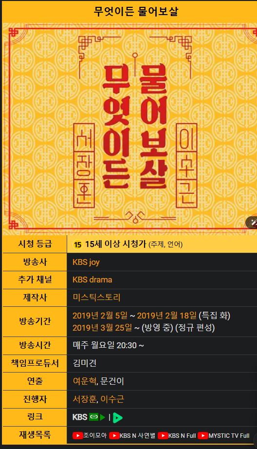 https://namu.wiki/w/%EB%AC%B4%EC%97%87%EC%9D%B4%EB%93%A0%20%EB%AC%BC%EC%96%B4%EB%B3%B4%EC%82%B4