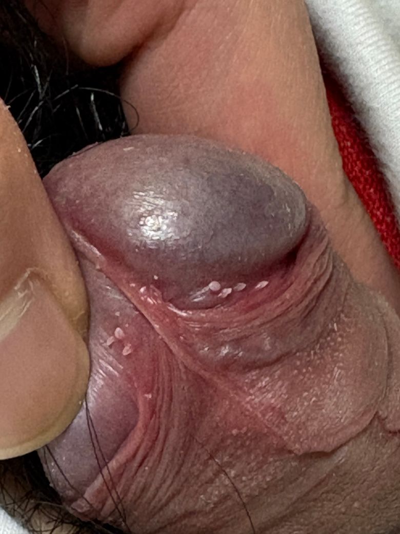 사진만을 정확한 진단은 어렵지만 귀두 진주양구진으로 보입니다. 이는 귀두나 음경에 나타나는 작은, 반투명한 또는 진주빛의 구진으로, 보통 크기가 1~3mm 정도이며, 주로 성인의 남성에게 발생합니다. 이는 질병이 아니고 피지선이 모여서 생기는 것으로 대부분의 경우 통증이나 가려움이 없으며, 치료가 필요하지 않습니다. 정확한 진단은 비뇨의학과 진료 보셔야합니다. 감사합니다.