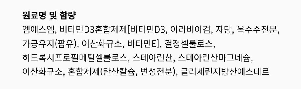 어제 제품을 받고 오늘 개봉을 했는데 사진에서 보이는 것 처럼 알약에 회색 반점이 있어서요. 무슨 문제가 있는건지 아니면 다른 이유가 있는건지 궁금해서 질문 남겨요. 두 번째 사진은 해당 약의 전체 성분입니다.