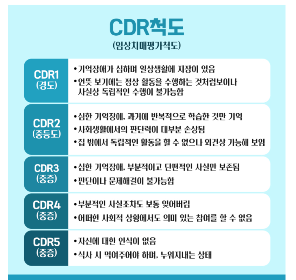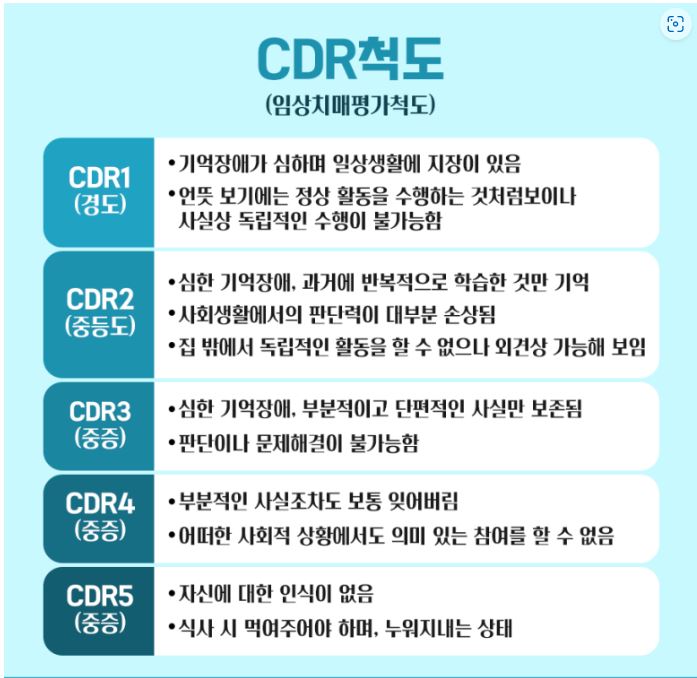 치매는 CDR척도에 따라서 초기인지 중증치매 인지 알수있습니다.