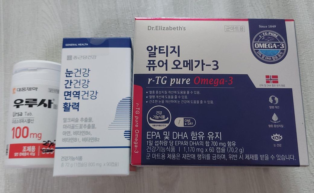 혈액검사 결과 콜레스테롤 수치가 높고, 고지혈증 같은 혈관 건강이 나쁘게 나왔습니다. 지방간도 있고요. 그래서 시댁에서 아래 3개 영양제를 보내주셨는데 한번에 같이 먹어도 될까요? 특히, 우루사는 하루 1알씩 3번 복용이라고 되어 있는데 그냥 먹어도 되는지 궁금합니다.
