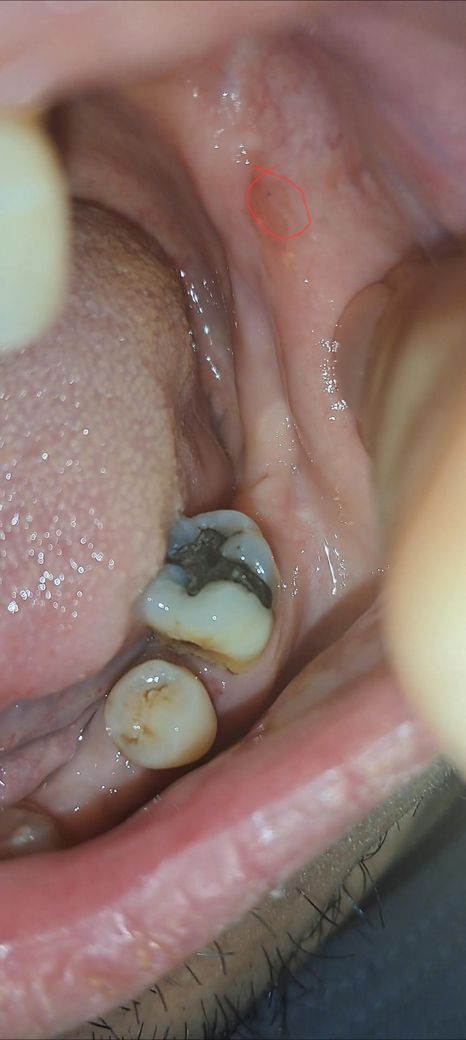 사진상으로 보이는 병변은 볼 점막에 국한된 1mm 미만의 매우 작은 검은 점으로, 표면이 비교적 매끈하고 궤양이나 출혈, 주변의 딱딱한 침윤 소견은 없어 보입니다. 이런 양상은 구강암보다는 점막 멜라닌 색소 침착, 미세한 점막하 출혈(아주 작은 멍), 치아나 보철물에 의한 반복적 자극 후 생긴 색소 변화, 드물게는 치과 치료 후 남은 금속 색소 침착(아말감 타투) 등 양성 원인일 가능성이 훨씬 높습니다. 구강암은 보통 크기가 점점 커지거나, 경계가 불규칙하고, 잘 낫지 않는 궤양, 쉽게 피가 남, 만지면 단단함, 통증이나 감각 이상이 동반되는 경우가 많습니다. 현재 설명과 사진만으로는 그 전형적인 모습과는 거리가 있어 보입니다. 다만 2주 이상 크기나 색이 변하지 않거나 점점 커지거나, 주변이 단단해지거나, 통증·출혈이 생기면 치과 구강외과나 이비인후과에서 직접 육안 및 촉진으로 확인받는 것이 안전합니다. 지금 단계에서는 경과 관찰이 합리적인 판단으로 보입니다.