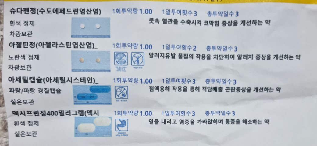 슈다펜정-코막힘 / 아젤틴정-알러지완화 / 아세틸캡슐-가래약 / 덱시프린정-소염진통제 로서, 증상이 없다면 굳이 드시지 않아도됩니다.