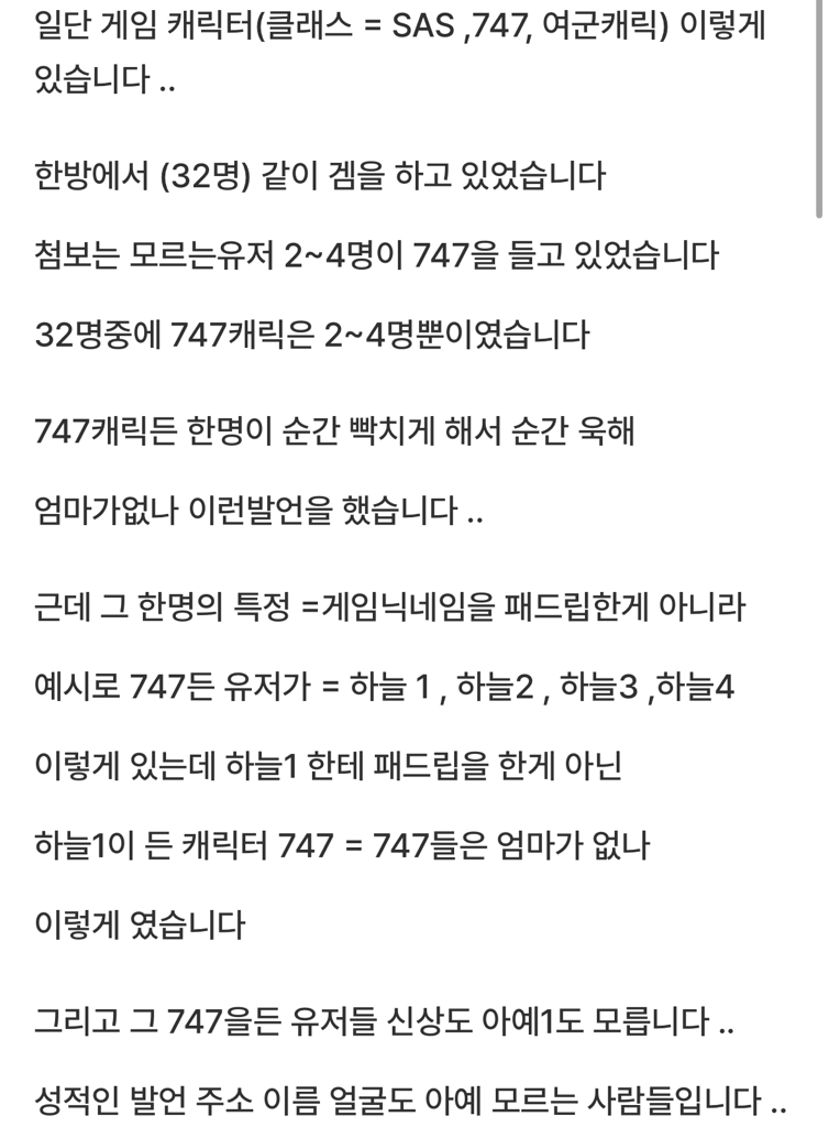 채팅에 성적인 발언은 아예 1도 한적없고요 특정인 한명한테 한적도 없습니다 그리고 상대들(?)은 챗에 이름나이성별지역 공개를아예 안했습니다 상대들 게임닉네임은