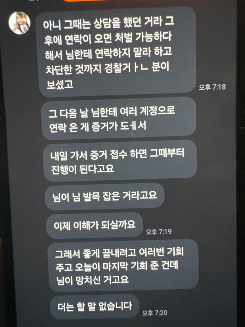 안녕하세요. 상대방이랑 첨에 거래 이야기 하다가 상대방이 경찰이야기 하면서 신고 했다면서 무서움을 조성하길래 거래 하고 거래 취하 할려고. 거래 대한 메시지를. 계속 해왔 습니다 근데 그 후. 상대 방이 문자를. 제가 거래. 안한다 하니까 돌변하여 경찰서에 신고 한다며해서 메시지도 오고 하였습니다 근데. 그 뒤로 오늘 상대방이 가서 상담을 받앗지 아직은 고소는 안했다며 님 발목은 님에 잡은거라며 그렇게 말을 했습니다2개의 답변이 있어요!