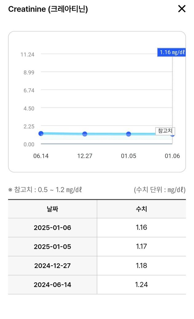 예전에 "신장 내과교수님께선 1.24수치는 근육이 많은 사람은 나올 수 있다 시스타틴 씨 검사에선 0.9수치로 정상이고 괜찮다"고 하셨는데