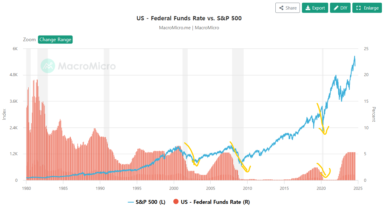 최근 사례들 보면 금리인하시기때 주식시장은 거의 무조건 무너졌습니다. 이번도 확률상으론 높습니다. 거시경제는 아무도 모릅니다만...