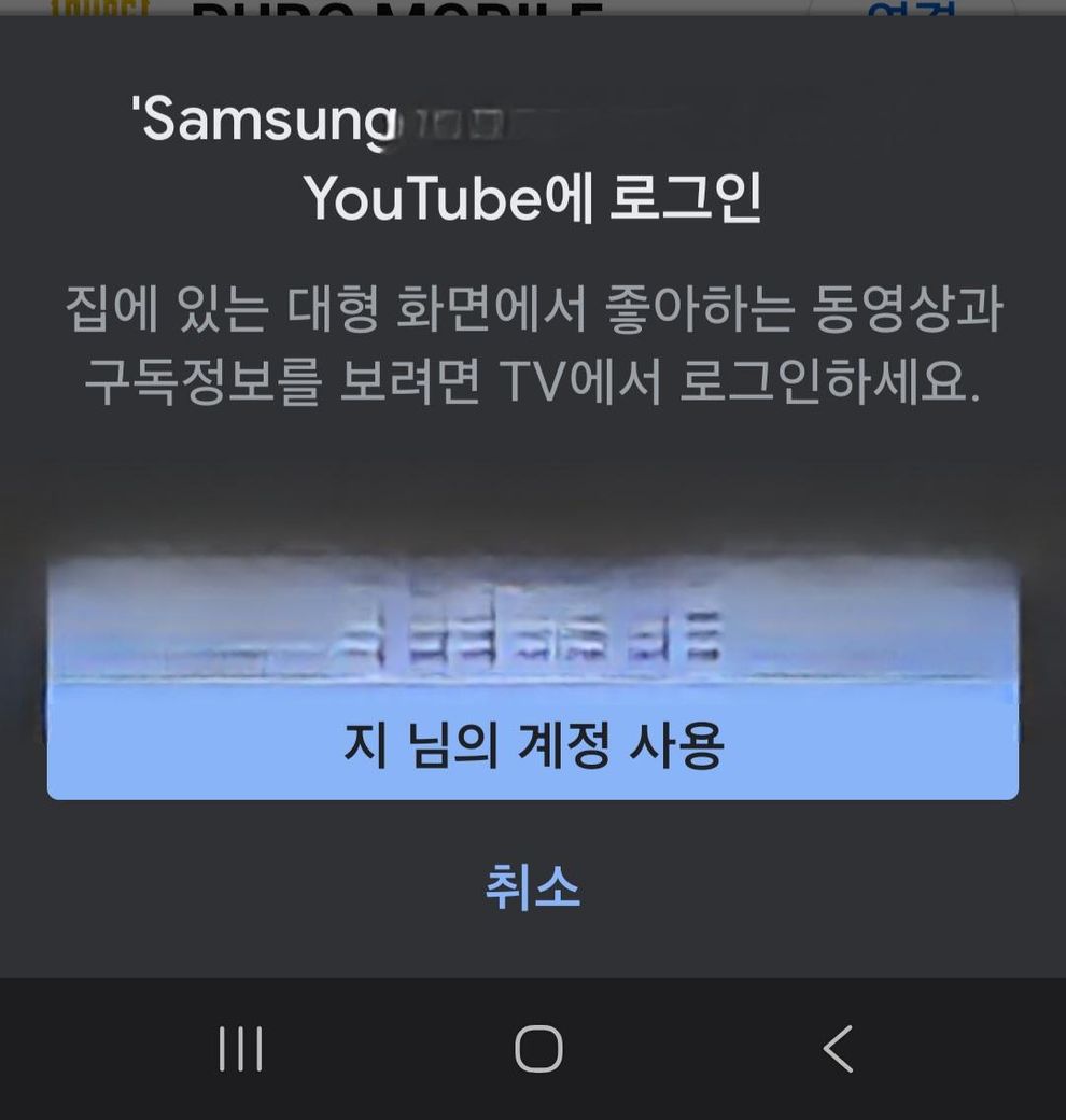 스마트폰에서 YouTube 앱을 사용하여 TV로 콘텐츠를 전송하거나 로그인할 때 나타나는 화면입니다. 사용자가 큰 화면에서 동영상과 구독 정보를 보려면 모바일 기기를 사용해 TV에서 로그인하도록 유도하는 메시지입니다.