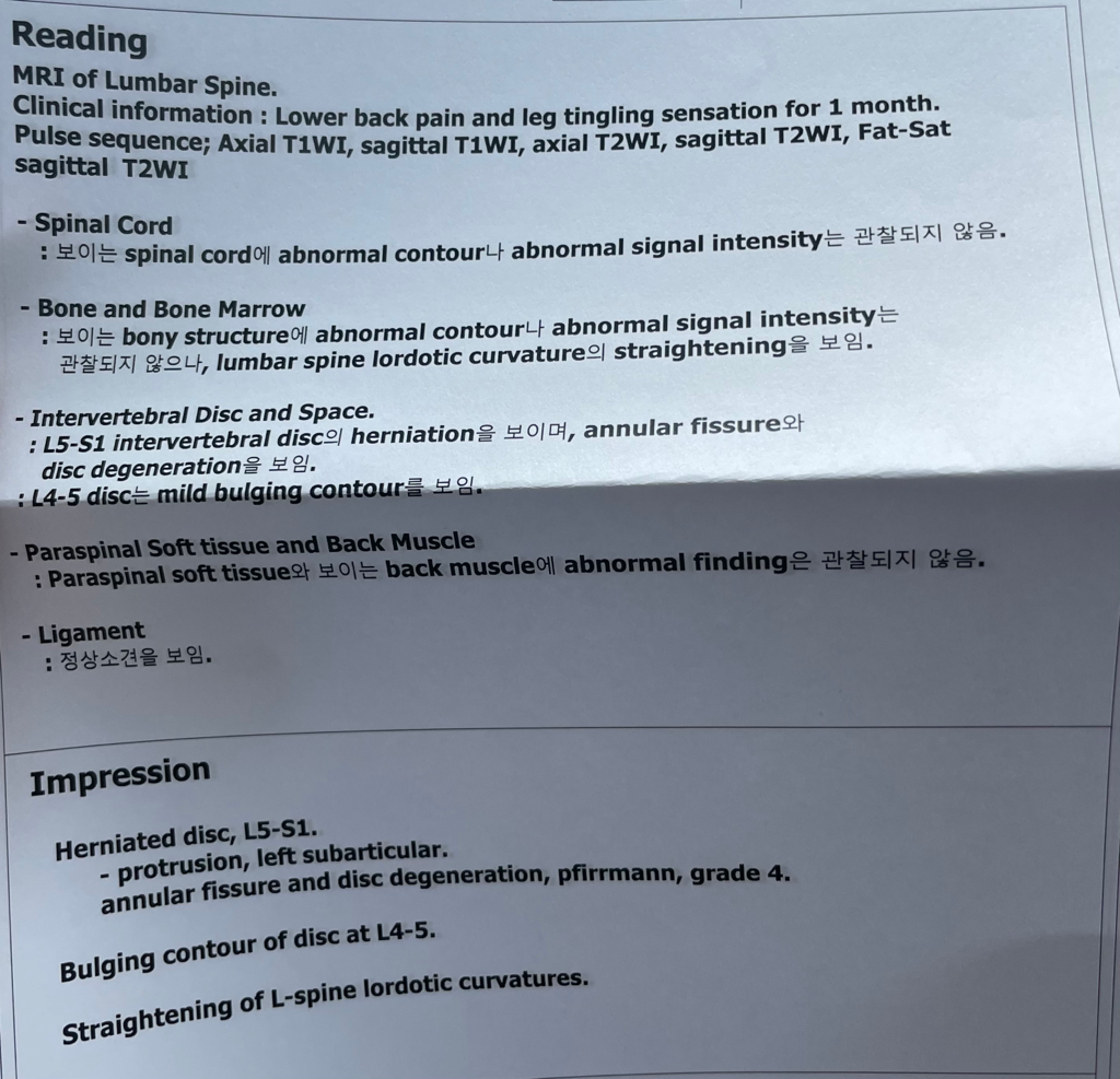 요추 5번과 천추 1번 사이에 디스크 탈출 및 퇴행성 변화가 있으며 요추 4번과 5번 사이 디스크는 약간 팽윤된 상태입니다. 허리 디스크로 인해 증상이 있다면 보존적 치료를 먼저 시행하시면 되겠습니다. 약물 치료, 물리 치료, 도수 치료, 주사 치료 등을 시행하면서 경과를 보시고 증상이 보존적 치료에도 전혀 효과가 없거나 증상이 심하다면 시술이나 수술적 치료를 고려할수 있습니다.
