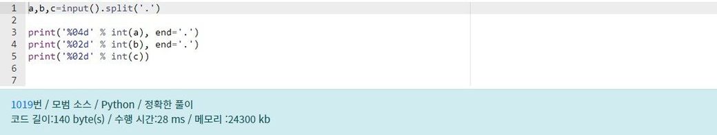 print("%d-%d-%d % 2020, 9, 2") // 2020-9-2 print("%d-%d-%d % 2020, 10, 10") // 2020-10-10 print("%04d-%02d-%02d % 2020, 9, 2") // 2020-09-02 print("%04d-%02d-%02d % 2020, 10, 10") // 2020-10-10안녕하세요~! 아하(Aha) 지식답변자 다라닝입니다.