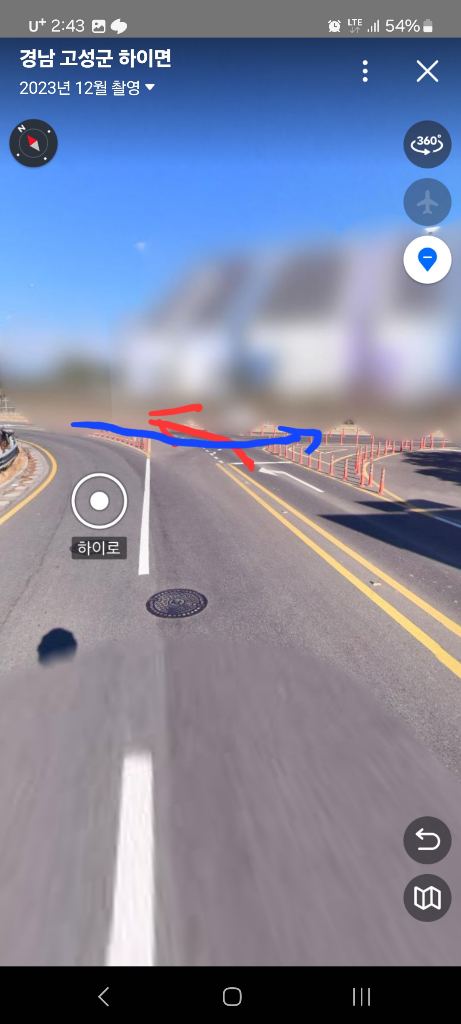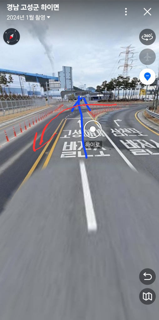 여기는 경남 고성군 하이로 에 있는 24년2월 네이버 로드뷰 지명 표시기준으로 '발전소삼거리'입니다. 네이버 로드뷰에서 확인했는데 차선이 이상하더라구요