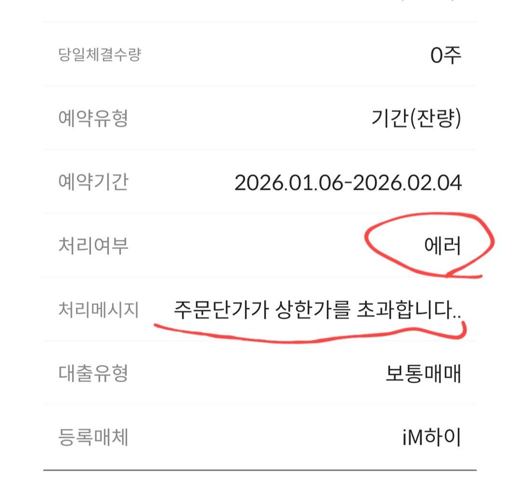 에러떴어요 주문단가 상한가 초과라 뜨는데 에러 뜨면 어떻게 되나요? 그 금액에 예약 매도가 안되는건가요?? 취소된건가요?
