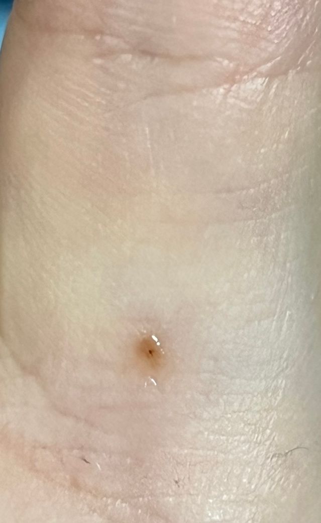 손바닥에 검붉은 점 하나가 안 없어지는데 뭘까요?