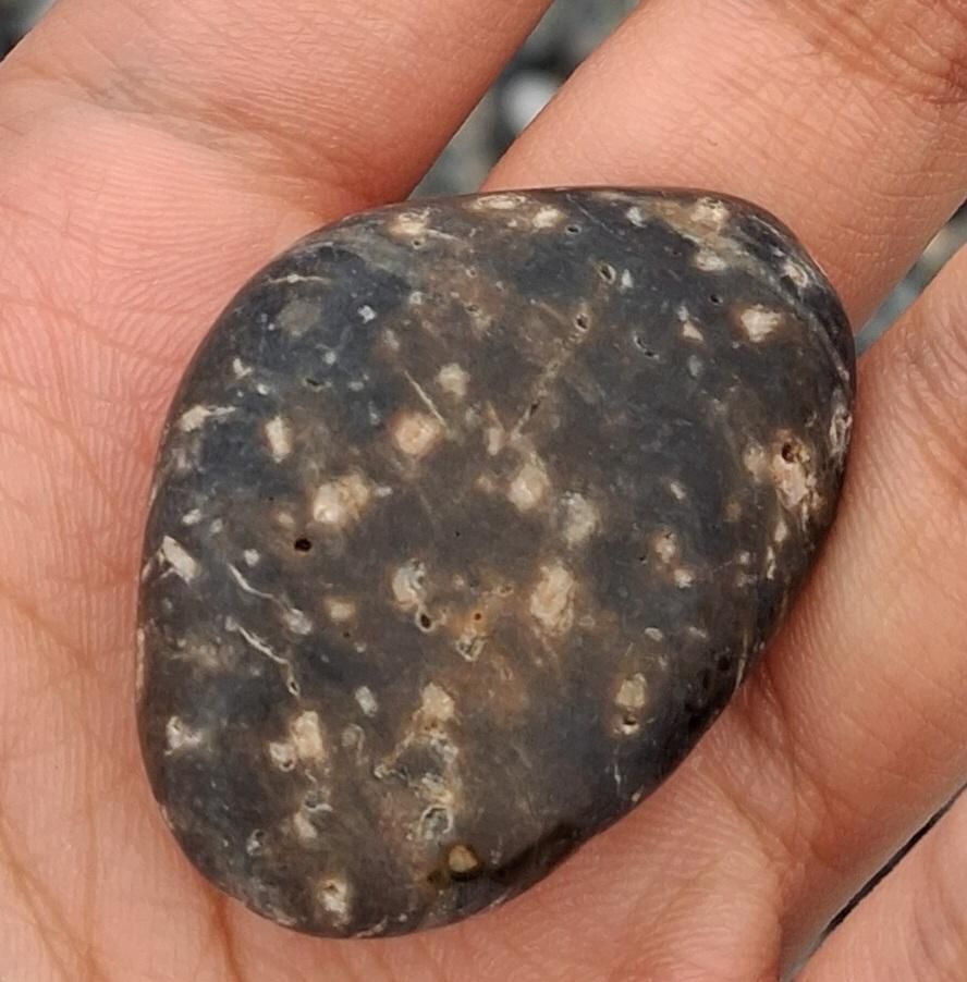 올려주신 사진의 돌은 몽돌 해변에서 흔히 볼수 있는 퇴적암 또는 화강암류로 보입니다. 돌 표면 박은 점무늬는 광물입자로 추정되고 둥글고 매끄러운 형태는 파도에 의해 마모된 몽돌 특성입니다. 정확한 종류를 확인하려면 지질학 전문 분석이나 현미경으로 광물 성분 확인이 필요합니다