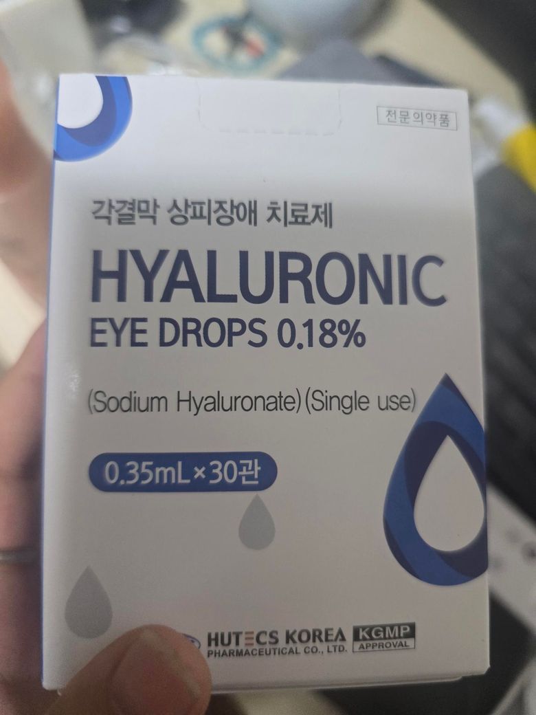 사진 속의 약인 휴텍스 제약의 히알우로닉 점안액 0.18%는 히알루론산 나트륨 성분의 안약으로 흔히 인공눈물로 자주 처방되는 성분입니다. 렌즈 착용과 같은 외인성으로 인한 각결막 상피장애에도 사용되지만, 흔히 안구건조증이라고 많이 부르는 건성안증후군에도 사용되는 약입니다. 따라서 일회용 인공눈물처럼 하루에 5~6회 사용하실 수 있습니다.