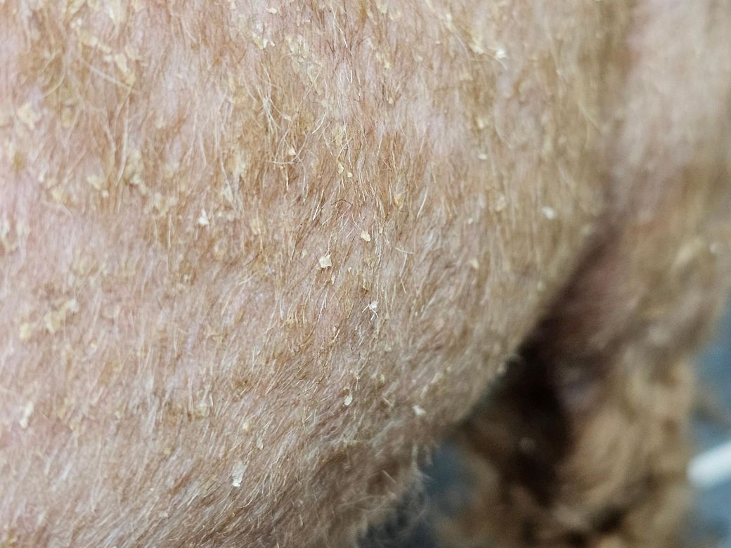 사진에서 발적(홍반)이 없는 상태에서 비듬만 많은 경우라면, 우선 심한 염증성 피부질환보다는 건성 피부염, 각질 이상, 영양 불균형, 환경적 요인(건조, 잦은 목욕, 난방기구 사용) 등에 의한 가능성이 조금 더 높습니다.
