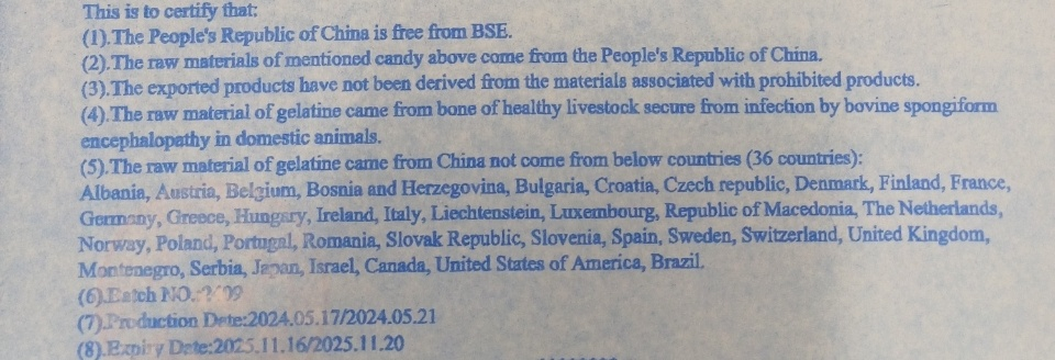 중국에서 소젤라틴을 수입할 때는 완제품을 상해에 있는 어딘가(식약처 상해 지부 등으로 추정)로 보내서 비용을 지불하고 시간을 들여서 검사를 완료해야 한국 통관에 지장이 없는 BSE 서류를 발급 받을 수 있다고 말하십니다. 이게 절차가 까다롭고 완제품을 그때그때 보내서 검사를 받고 수출을 해야 하는 상황이다 보니 중국에서 소젤라틴이 함유된 젤리 수입이 몇 년 전부터 많이 줄었다고 말씀을 주십니다.