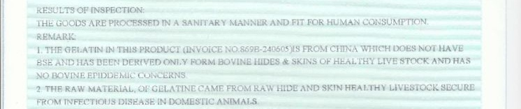 5번 항목이 필수적으로 들어가야 중국에서 소젤라틴이 함유된 젤리를 수입할 때 통관이 가능하다고 합니다.