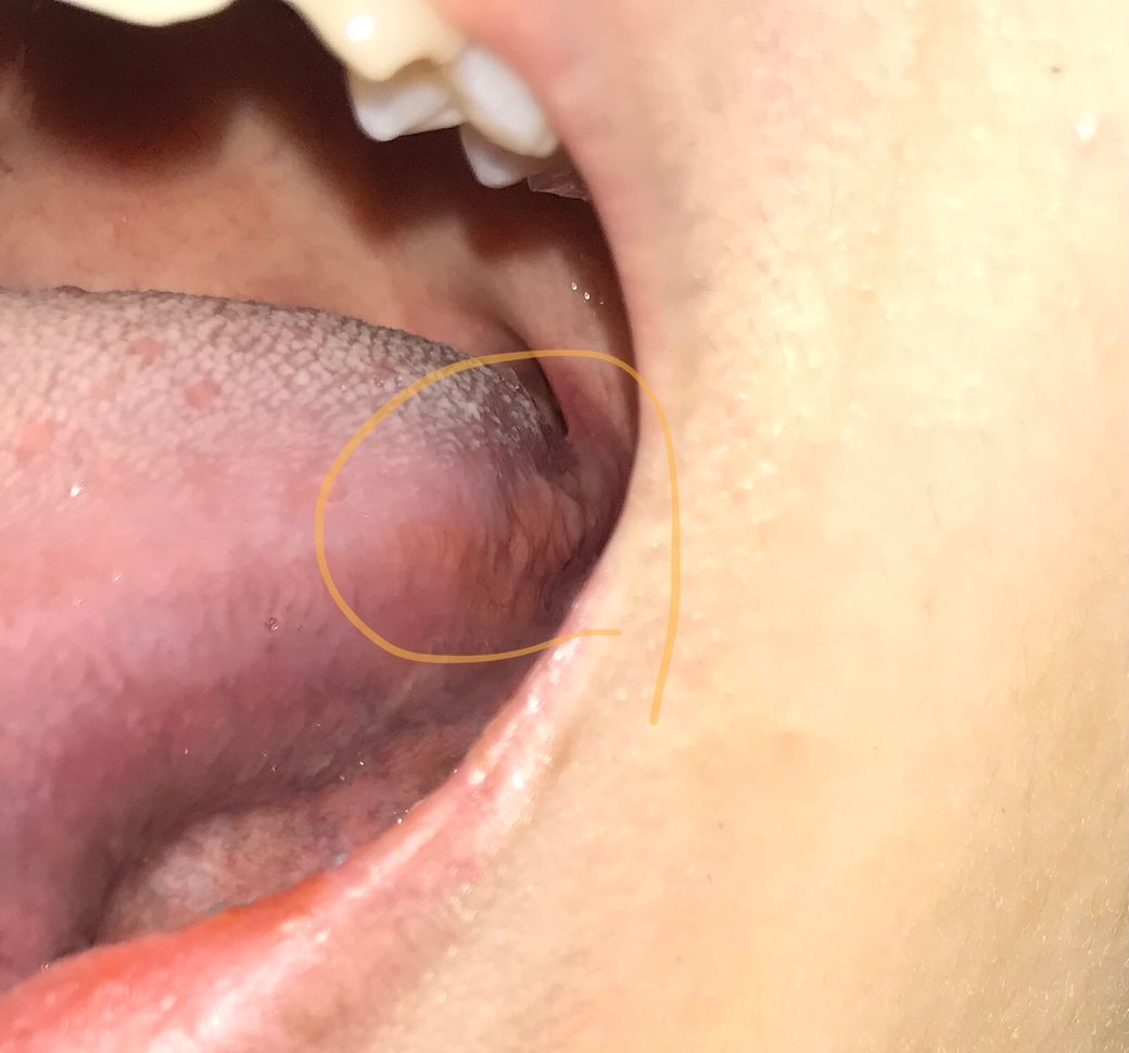 해당부위는 혀에 힘이 가해지거나 하면 옆으로 밀리면서 생길수 있는 증상으로 보입니다.