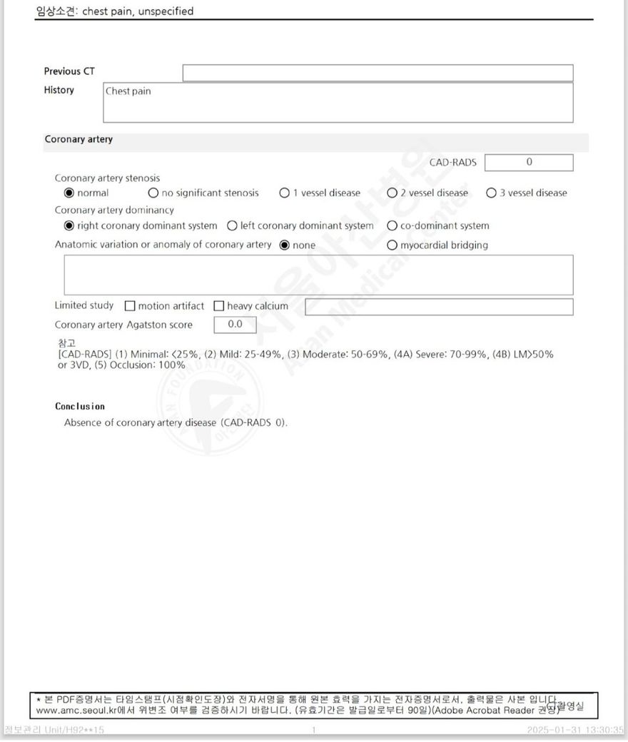한달 전 흉부 통증 및 호흡이 잘안되 급히 아산병원 응급실에서 가서 검사한 심장ct 검사지 입니다 위 내용을 해석 좀 부탁 드리 겠습니다.