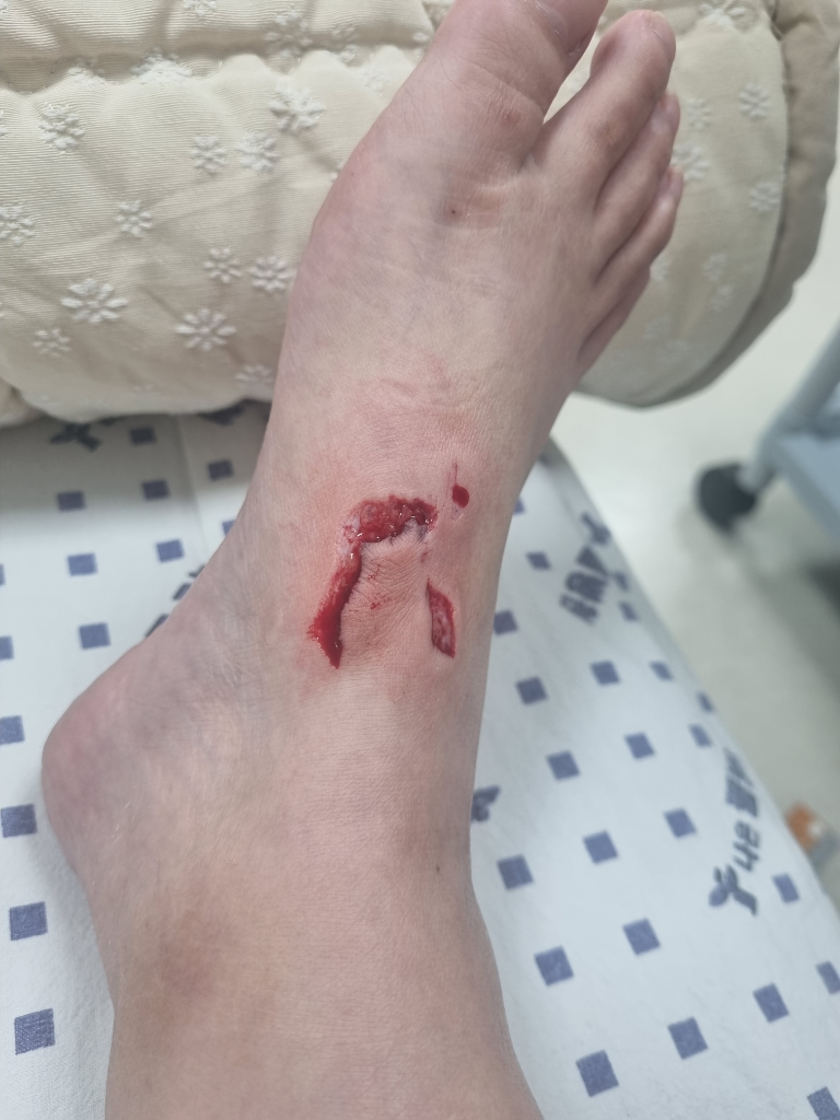 베란다랑 방안을 연결해주는 중문 한쪽이 다 깨지는 사고로 오른발 발등이 많이 찢어 졌습니다.