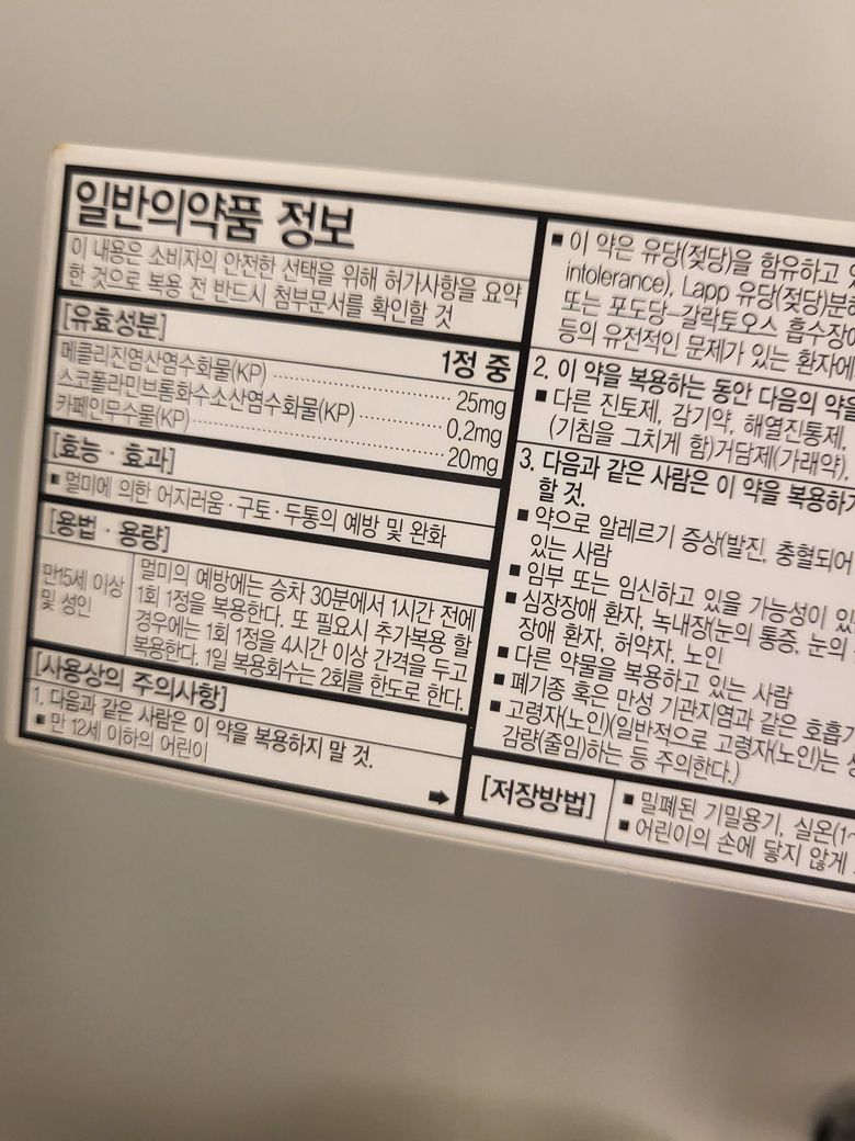 메카인정 공복에 복용해도 되는지 궁금합니다 배멀미를 예방하기 위해서이며 성분은 사진에 첨부하였습니다 아침에 공복상태에 복용해도 괜찮을까요