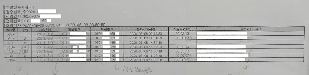 ★역발신 통화내역 1건이 나왔다는 기록의 출처는 LG U+라고 페이지하단에 표시되있으며