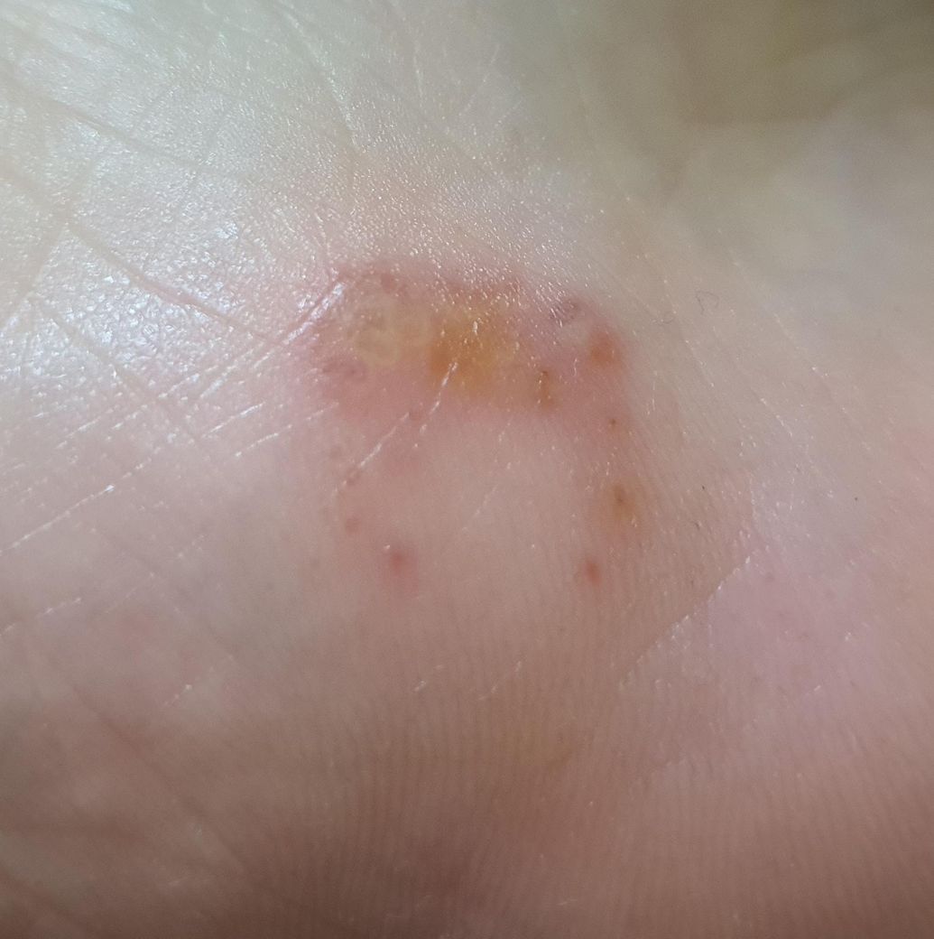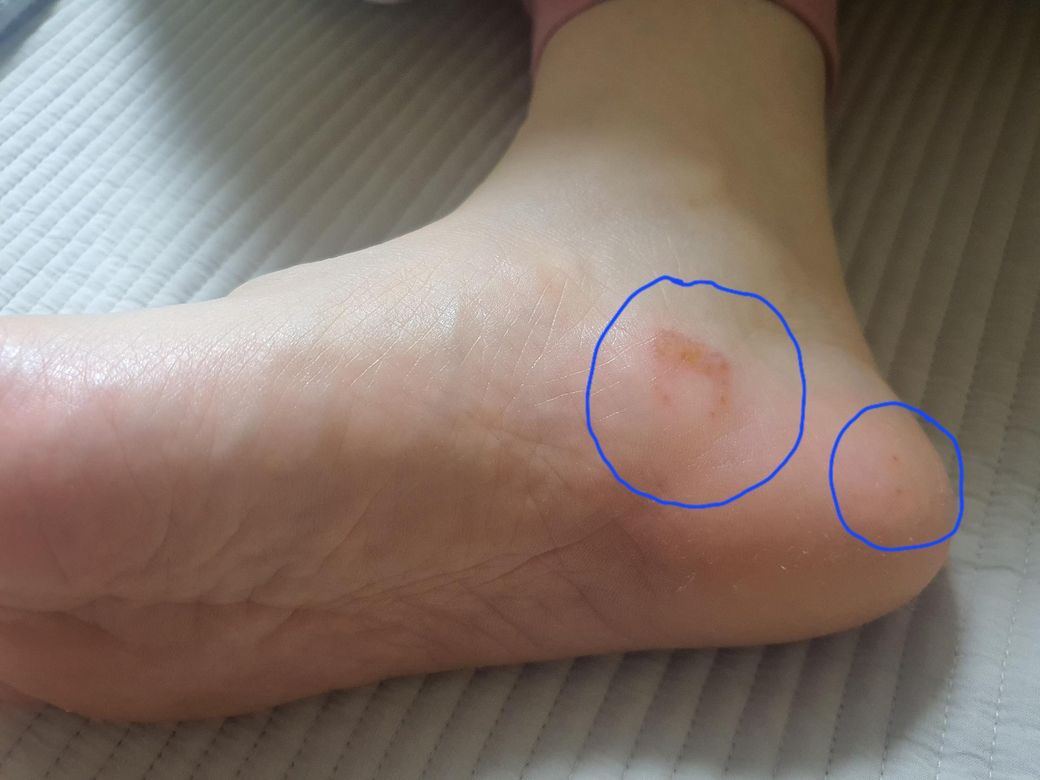 오른쪽 발바닥 안쪽 오목한 곳에 이런 수포고가 생겨써요