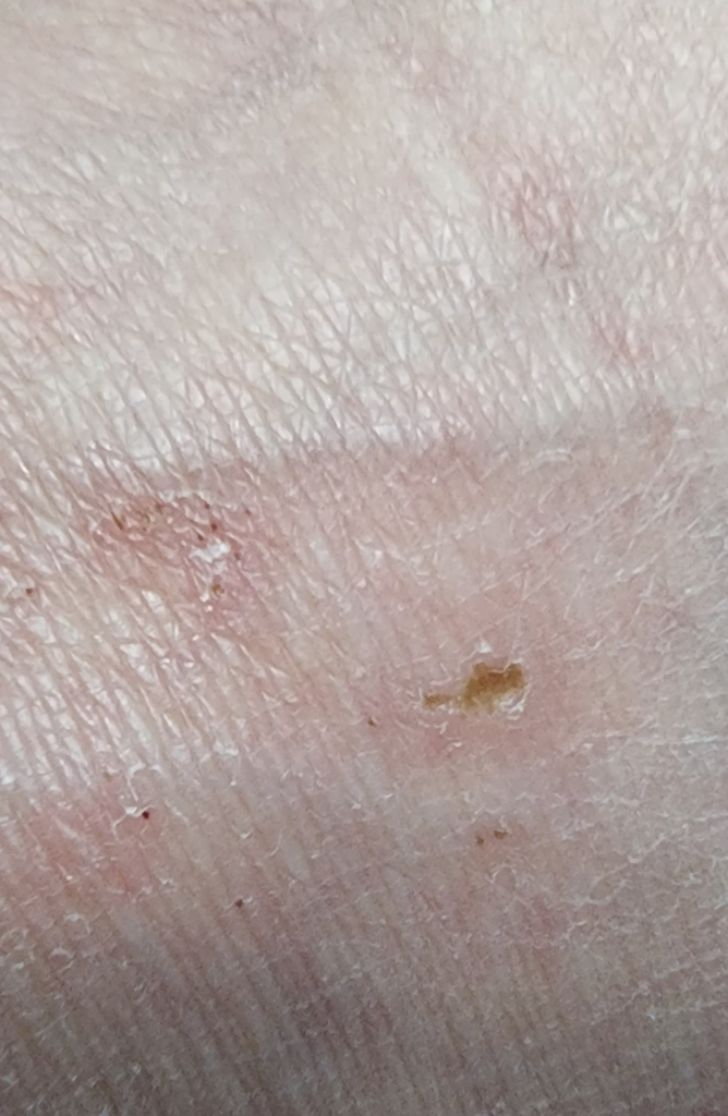 건조해서 발생한 증상으로 추정되고 긁어서 생긴 상처로 보입니다. 무좀같지는 않고 일단 보습제 바르며 지켜보시되 증상이 나아지지 않으면 피부과를 방문하시기 바랍니다.