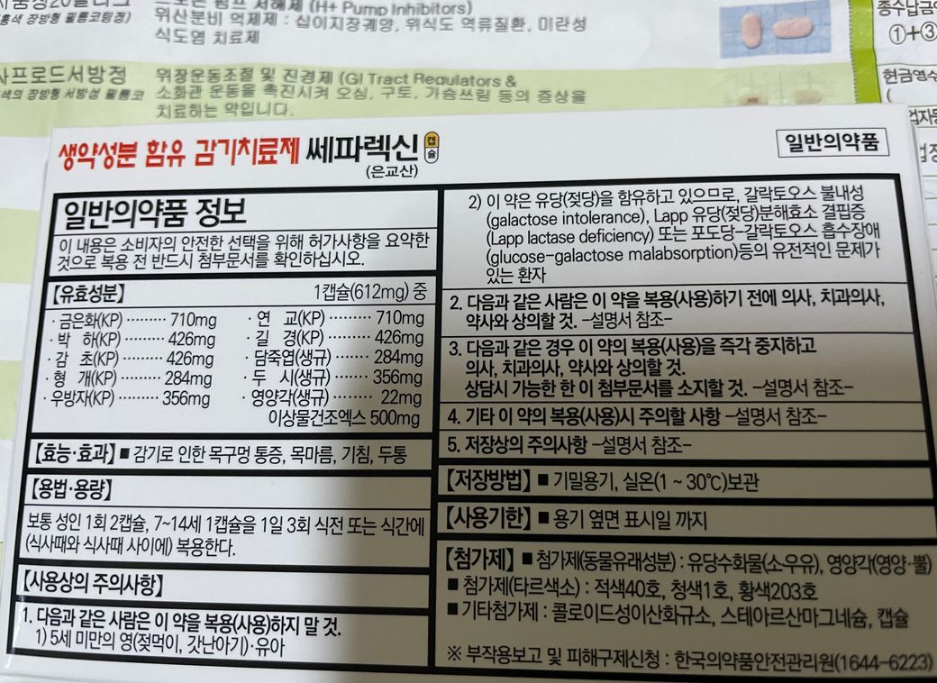 역류성 식도염 약을 처방받아 복용중인데 (1일 1회 각 1캡슐씩/2주분) 약국에서 구매한 감기약 쎄파렉신을(1일 3회 2캡슐씩) 같이 복용해도 괜찮을까요?