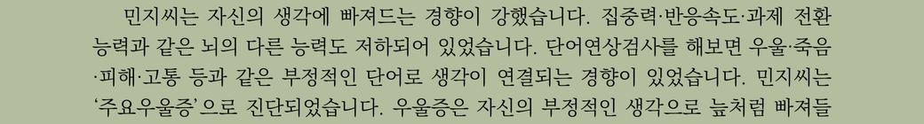 - 이 내용으로 판단해 보았을 때, 민지씨가 받은 검사는 '풀배터리 심리검사' 중 일부인 '단어연상검사'와 관련된 내용으로 보입니다. 풀배터리 심리검사는 일반적으로 다양한 심리 상태와 인지 기능을 평가하기 위해 여러 검사로 구성된 종합 검사입니다.