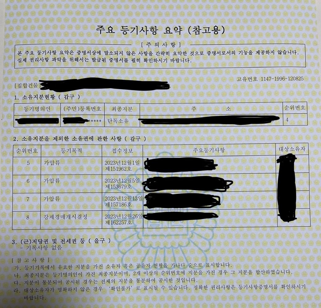 임대인의 채권자들로부터 가압류 등기가 경료된 시기는 2023. 12. 1.로 보이고, 그 전에 이사 및 전입신고, 확정일자까지 받았다면 선순위 임차인에 해당됩니다. 집이 경매될 경우 계약기간까지는 물론 계약기간 만료 후에도 낙찰자(임대인의 지위를 승계하게 됩니다)가 보증금을 지급하지 않는다면 계속 임대한 주택을 점유할 수 있습니다(이를 대항력 행사라고 합니다).