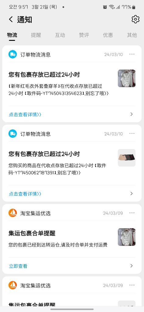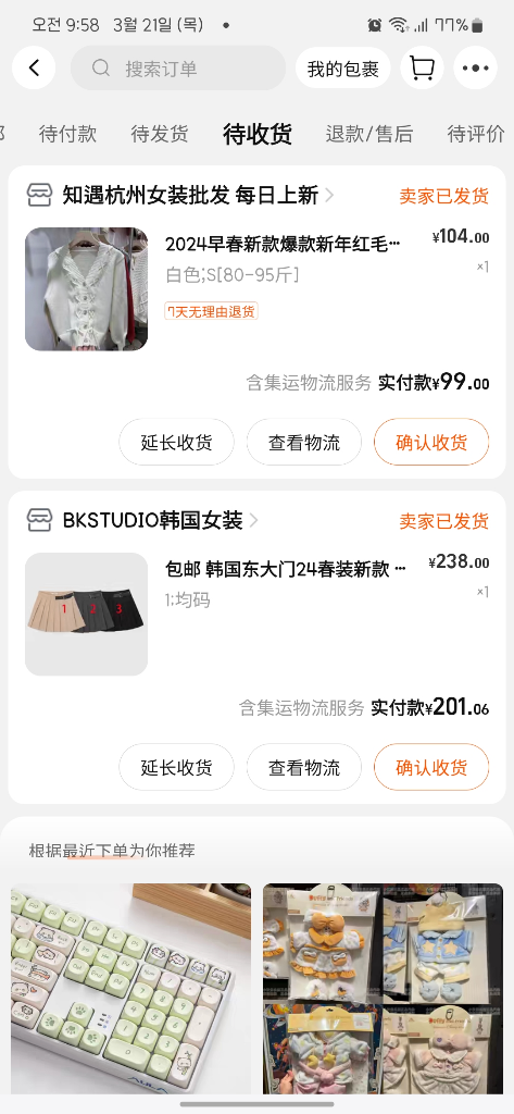 타오바오에서 옷을 구매하였는데 며칠이 지나도 오지 않고 있어서요..ㅠㅠ 혹시 제가 뭔가 잘못한건가 싶어서요 번역기를 돌려봐도 수취확인이나 연장수취만 뜨는데 이게 무슨 말인지 잘 모르겠어요 직구가 아닌가봐요...