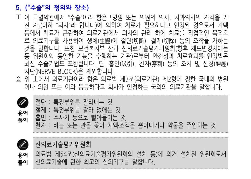 보험사에서의 수술은 근육, 검, 인대를 절제, 절단, 하는 것을 의미합니다.