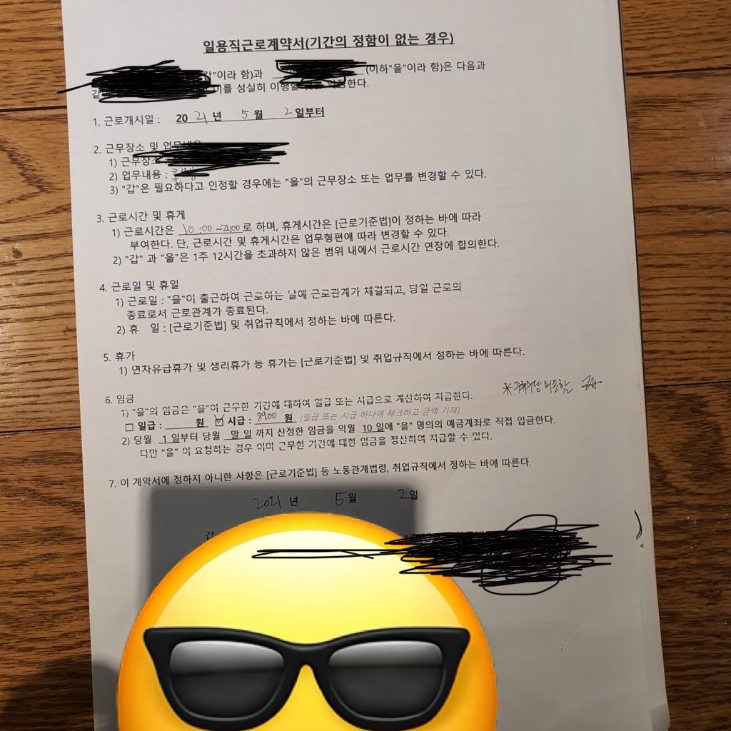 근로계약서도 작성하였고, 매월 3.3%씩 원천징수금이 공제되어 월급이 들어왔습니다. 저는 주로 주말 풀타임 알바뿐만 아니라 평일에도 가끔씩 반타임 근무를 하였습니다. 풀타임을 할 경우 보통 하루에 10시간씩 근무하고, 근무기간동안 대부분의 달은 60시간 이상씩 근무하였습니다.